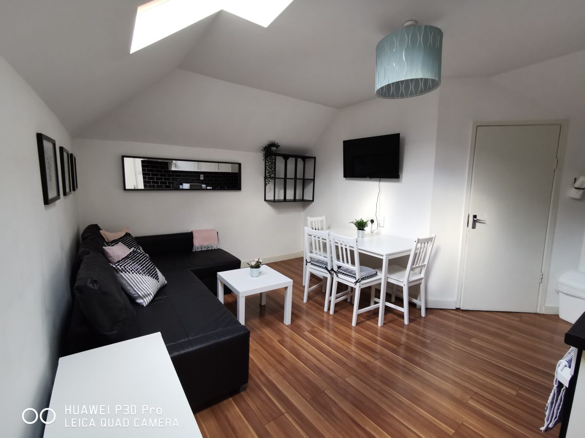 The apt comprises of 1 bedroom with a shower room. There is a large living/dining room. Formerly and Airbnb the apt is bright with Velux windows illuminating the space.